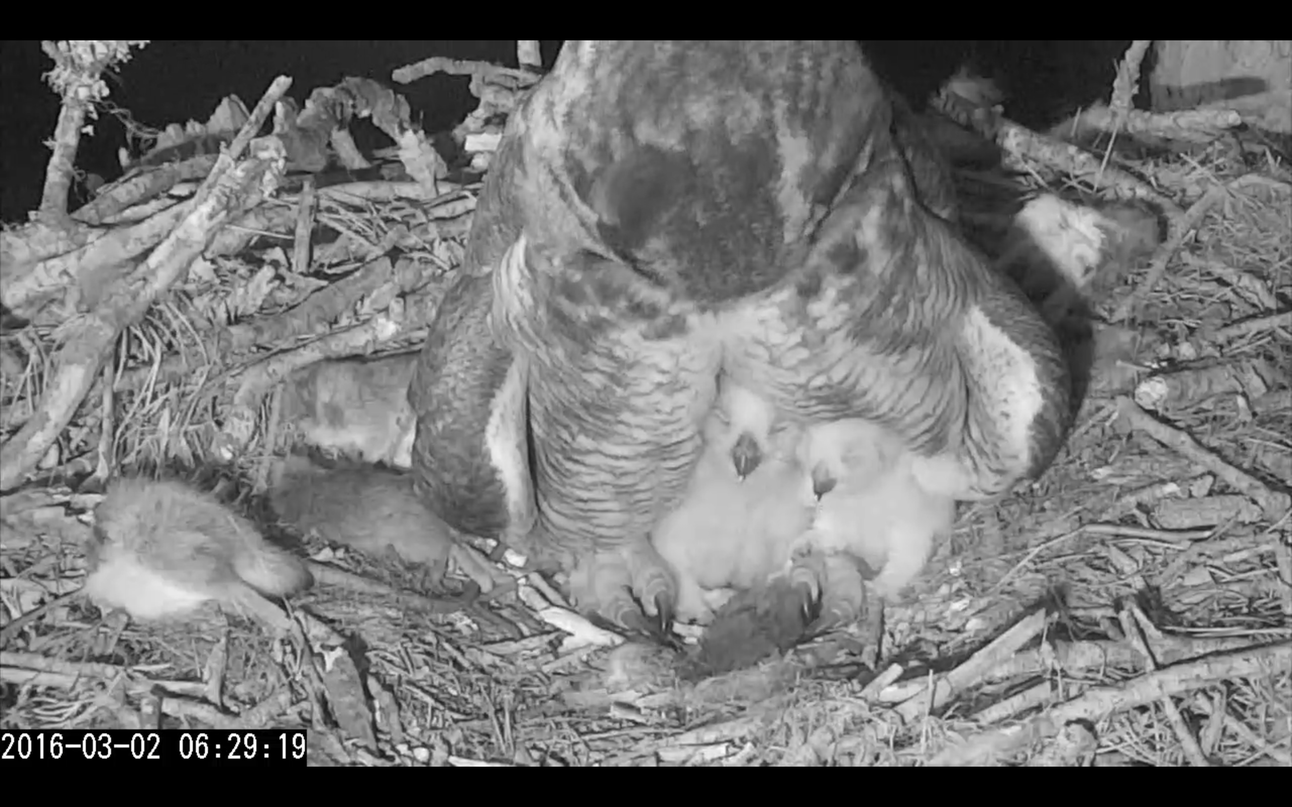 Note there’s plenty of prey in the nest, but it’s been going fast. Mom needs plenty of food to keep the owlets warm, and they are growing fast and need that fuel!