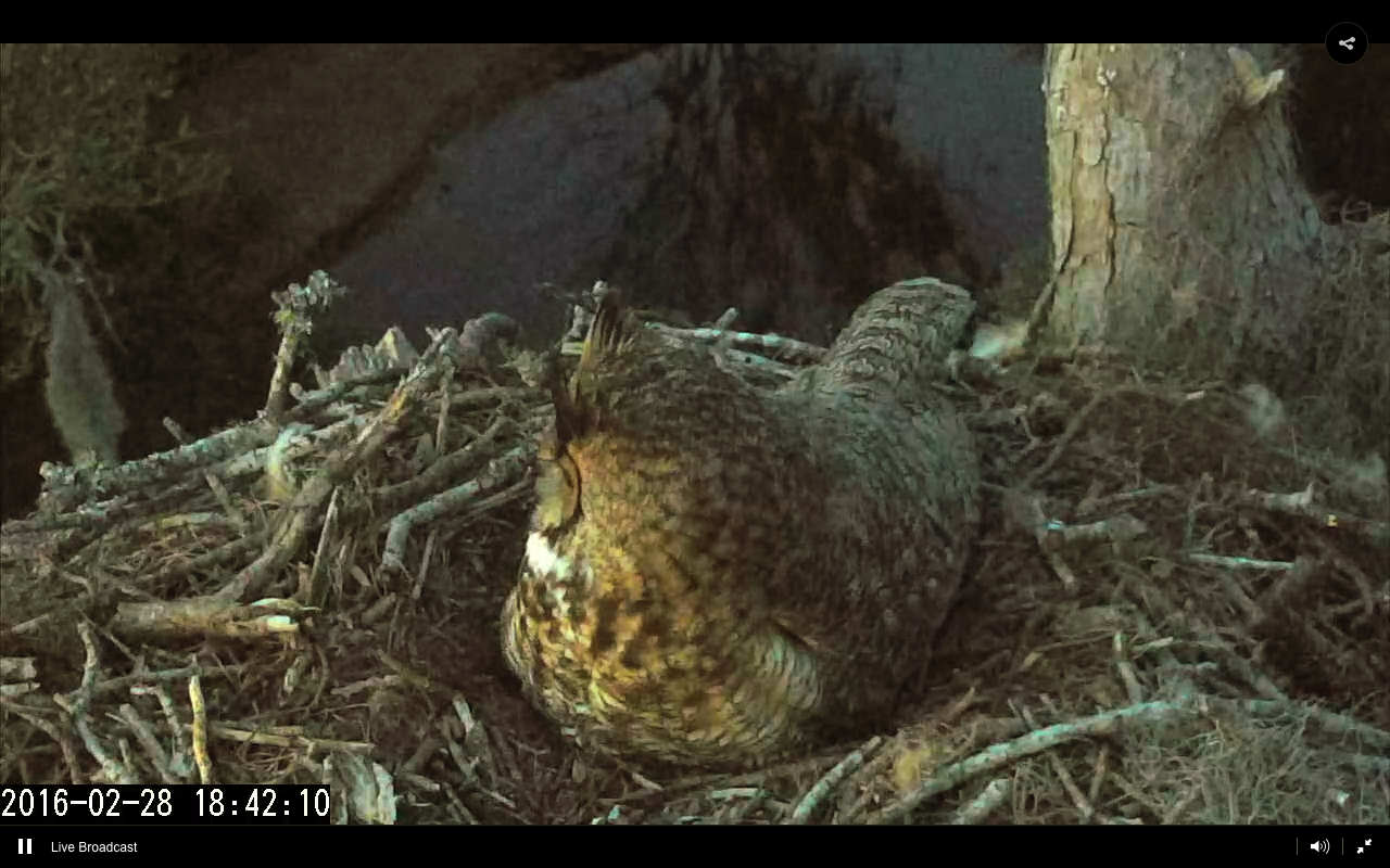 Finally about two hours after dark on Sunday, Dad brought a rat and stashed it in an adjacent tree. Mom hopped out of the nest to quickly retrieve it.