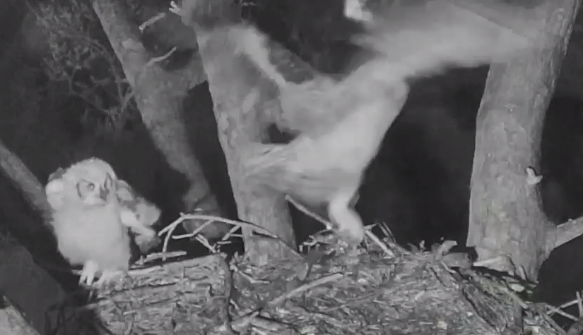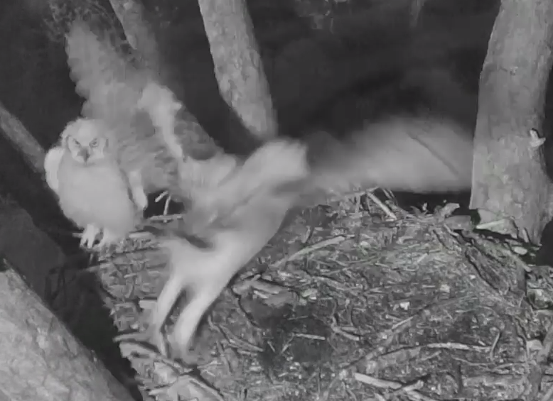 Older Owlet Takes Off!Just a few more feet!Great View From Up Here!Younger Owlet – Me too!While You’re Up There I’ve Got Room to Spread My Wings!I’m Back – The Secret Of A Good Landing Is To Absorb The Shock With Your Legs, OK?