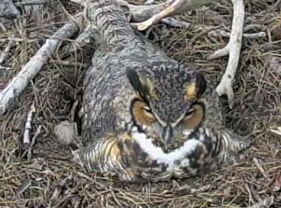 every night for a couple of weeks now, and the female was on the nest all day on 12/31. We thought she’d produced an egg, but she left in mid-afternoon with no egg in the nest. Then she returned in the middle of the night and hasn’t left since. At 3:00 today January 1, 2015 we got our first glimpse of the first egg. Looks like we’re officially an owl’s nest, and we are hoping to be able to bring the Great Horned Owl Cam online for the world to see in the near future. Meanwhile, here’s a couple of screen shots of the Mom and her first egg.